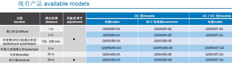 • 光學功能產品選擇廣泛:漫反射型:2m;帶背景抑制功能漫反射型:500mm;帶偏光濾鏡型鏡反射型:6m;對射型:20m。雙區多功能輸出狀態 LED.