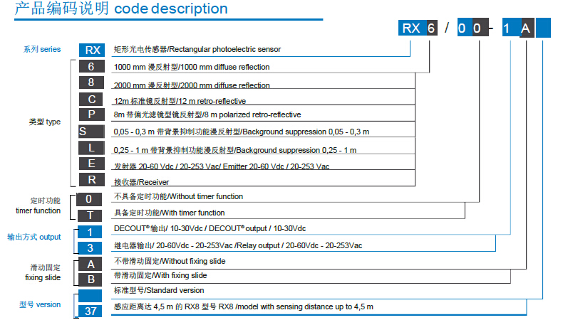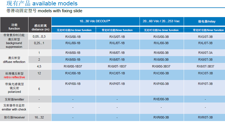 • 產品型號:漫反射型,標準鏡反射型,帶偏光濾鏡型鏡反射型,對射型和帶背景抑制功能漫反射型 Models: diffuse reflection, retro-reflective, polarized, through-beam and background suppression