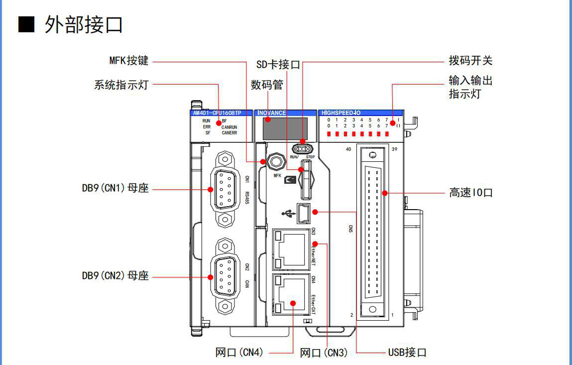 內置EtherCAT總線 可帶4或者8個伺服軸(其中AM401可帶4軸,AM402可帶8軸),支持同步定位,電子凸輪,插補功能 可同時擴展125個機架,可擴展32000個IO點 ·內置CAN總線 支持CANopen協議,并支持8個從站。 支持CANlink協議,并支持8個從展,可擴展H2u系列遠程模塊以及兼容設備 ·內置通用以太網,可支持工程調試,Modbus_TCP協議(服務器、客戶端) ·內置1路RS485,支持ModbusRTU協議 ·內置USB接口,支持工程下載調試 ·支持直接擴展8個模塊 ·內置高速IO,16通道200K高速輸入,8通道200K高速輸出,可支持 4軸脈沖運動控制 ·支持IEC-61131-3 六種編程語言IL,LD,FBD,SFC,CFC,ST ·邏輯位指令1ns,字傳送指令4ns ·程序容量10M Word,數據容量8M Word,支持TF擴展存儲容量