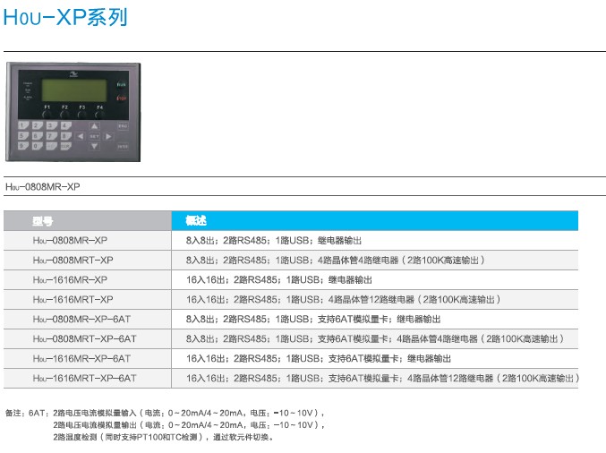 H0U系列控制器具備可編程邏輯控制(PLC)和可編程文本顯示器(TOD)功能的工業用控制器,均給用戶提供了開放的二次編程功能。其硬件配置功能豐富,集中的開關量輸入輸出端口、模擬量輸入輸出端口、可編程通訊端口、以及可編程中英文顯示液晶屏界面,功能強大實用,可用于恒壓供水、螺桿空壓機、拉絲機等工業設備上,尤其是與MD320系列變頻器配合工作,能使得控制系統更簡潔,功能更強大。目前H0U系列有H0U-88B1L和H0U-88B1G兩款機型,根據行業不同,提供了不同的結構型式。在以下的描述中以H0U-88B1L/G代表兩種機型。