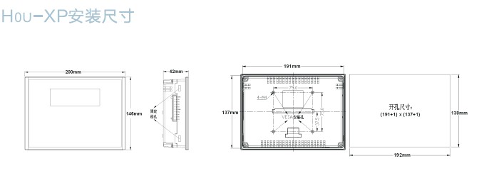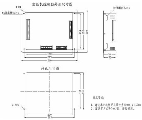 控制器為一體結構,采用空壓機柜門嵌入安裝方式,控制器安裝尺寸如下: 控制器采用四枚金屬掛件固定。將控制器嵌入面板后,由柜面內側將掛鉤嵌入掛鉤固定孔,向柜面側旋緊掛鉤上的螺釘即可。(部分機型提供了四個固定螺柱)