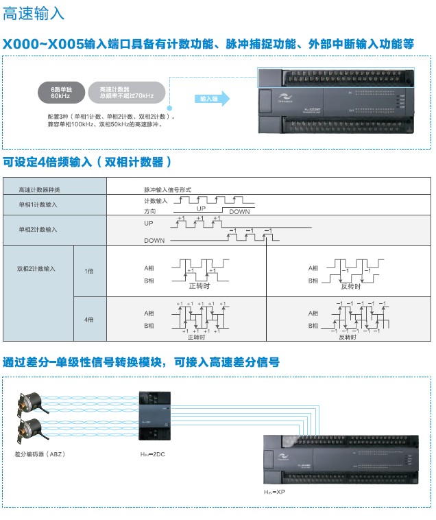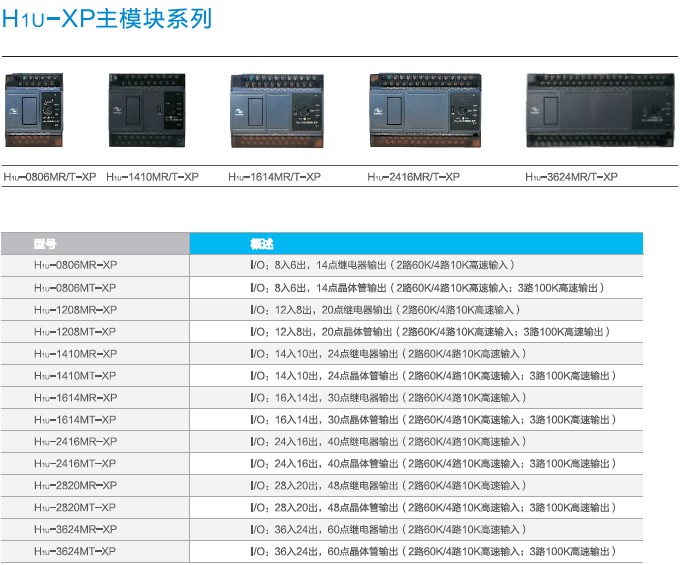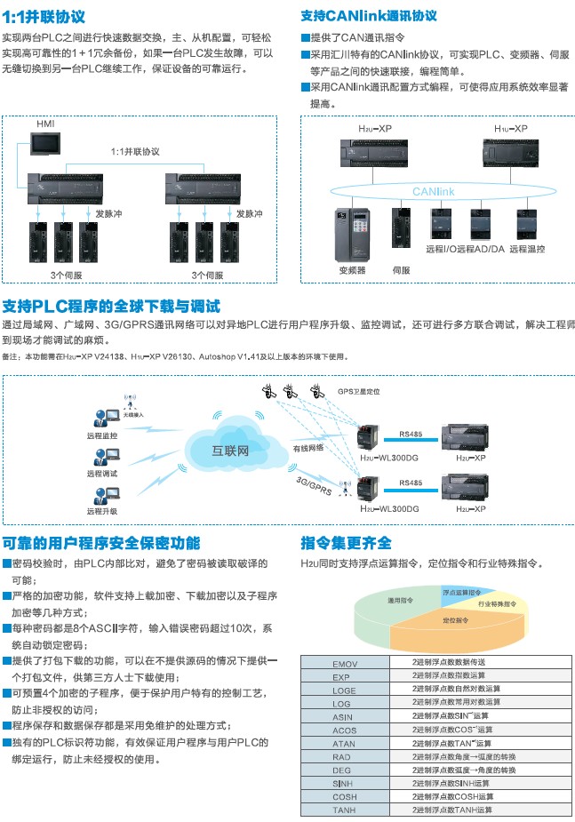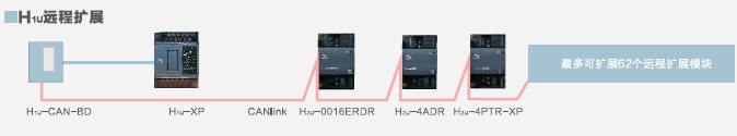 H1U可編程控制器的主要特點: 1.程序存儲空間大,無需外部擴展內存卡即可達到8K步; 2.用戶程序和所有掉電保持元件在掉電情況下永久保存,實時時鐘在掉電情況下至少保持20天(上電時間大于5分鐘),不需要電池; 3. 提供多通道高頻率高速輸入輸出端口,豐富的運動和定位控制功能; 4.集成兩個獨立通訊口,提供了豐富的通信協議,提供MODBUS指令,方便系統集成; 5. 提供完備的加密功能,保護用戶知識產權; 6. 具有強大的組網能力,支持CAN-BUS。
