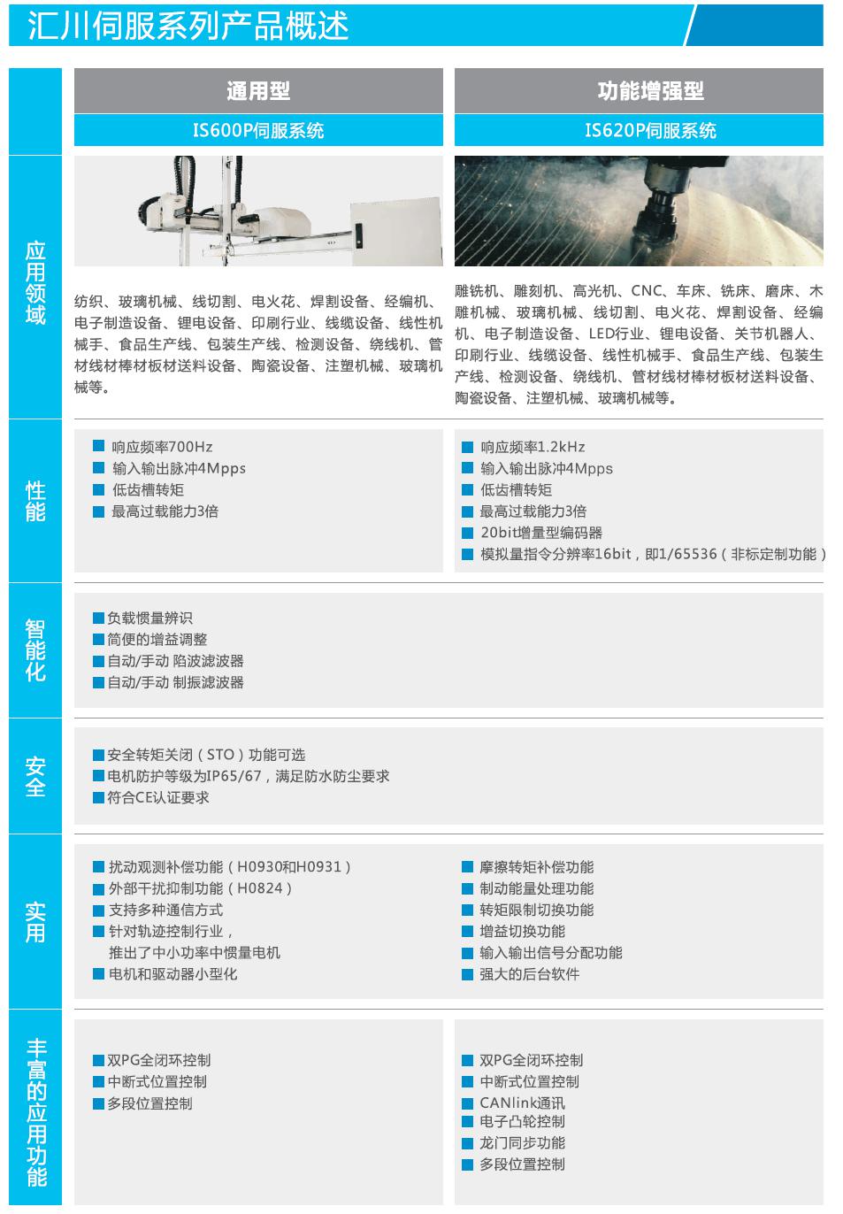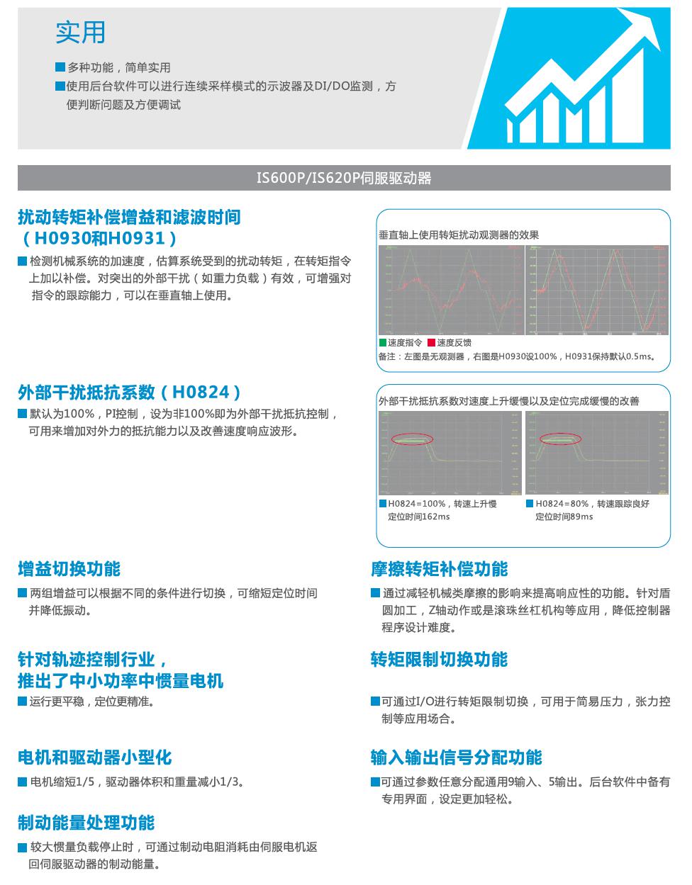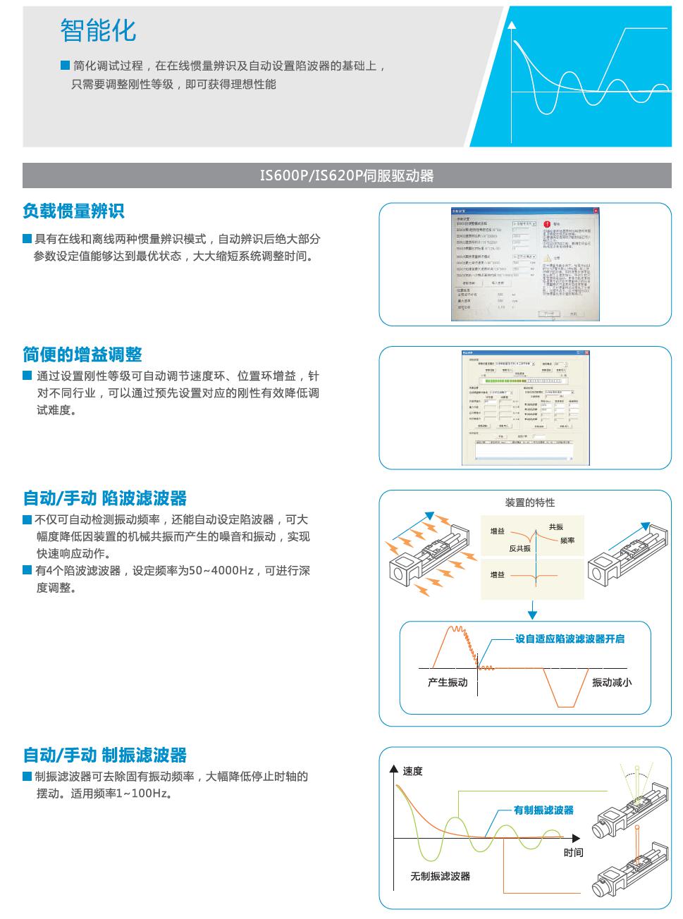 IS600系列伺服驅(qū)動(dòng)器產(chǎn)品是匯川技術(shù)研制的高性能中小功率的交流伺服驅(qū)動(dòng)器。該系列產(chǎn)品功率范圍為100W~7.5kW,支持Modbus通訊協(xié)議,采用RS-232\RS-485通訊接口,配合上位機(jī)可實(shí)現(xiàn)多臺(tái)伺服驅(qū)動(dòng)器聯(lián)網(wǎng)運(yùn)行。提供了剛性表設(shè)置,慣量辨識(shí)及振動(dòng)抑制功能,使伺服驅(qū)動(dòng)器簡(jiǎn)單易用。配合包括小慣量,中慣量的ISMH系列20位增量式編碼器的高響應(yīng)伺服電機(jī),運(yùn)行安靜平穩(wěn)。適用于半導(dǎo)體制造設(shè)備,貼片機(jī),印刷電路板打孔機(jī),搬運(yùn)機(jī)械,食品加工機(jī)械,機(jī)床,傳送機(jī)械等自動(dòng)化設(shè)備,實(shí)現(xiàn)快速精確的位置控制,速度控制,轉(zhuǎn)矩控制。