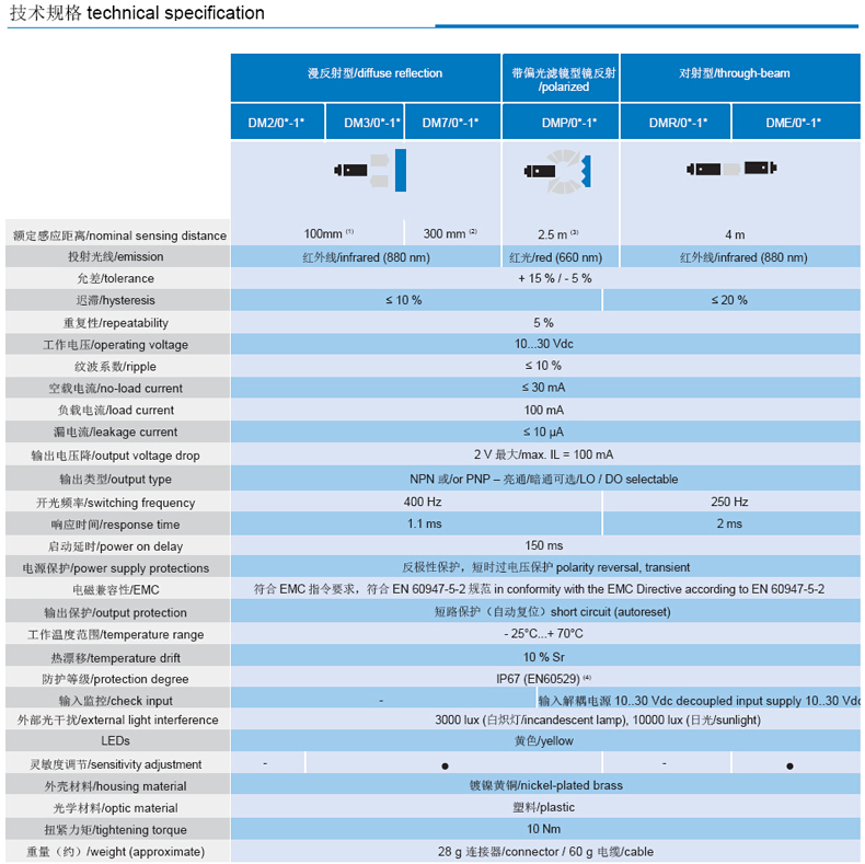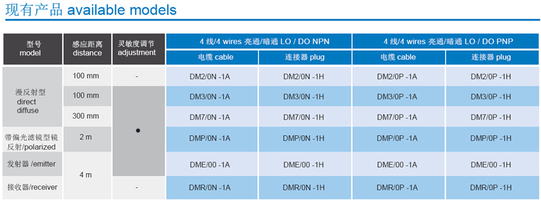 • 漫反射型、帶偏光濾鏡型鏡反射型、對射型產品 Models diffuse reflection, polarized and through-beam
