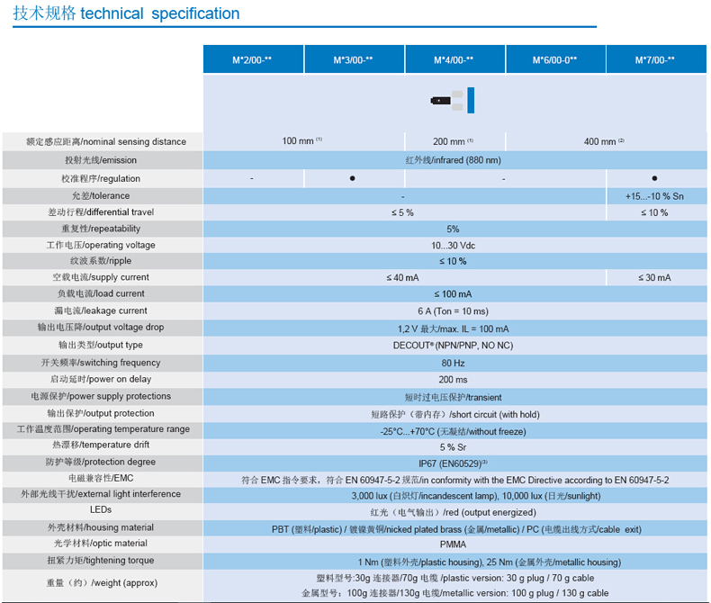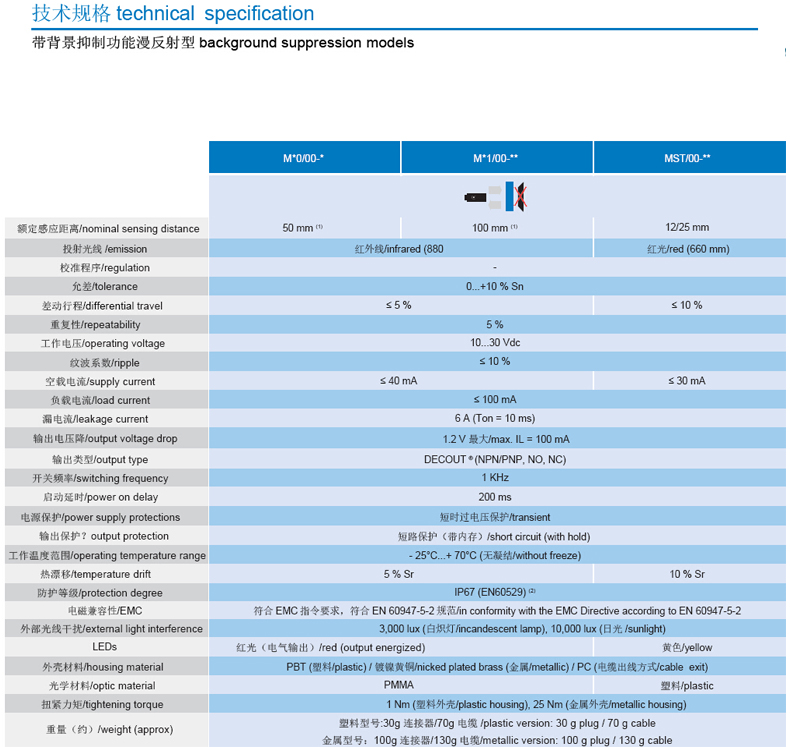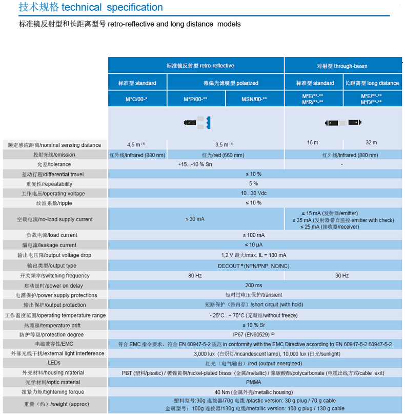 • 產品范圍廣泛:漫反射型,標準鏡反射型,帶偏光濾鏡型鏡反射型,對射型和帶背景抑制功能漫反射型 Wide range of models: diffuse, retro-reflective, polarized, through-beam detection and background suppression