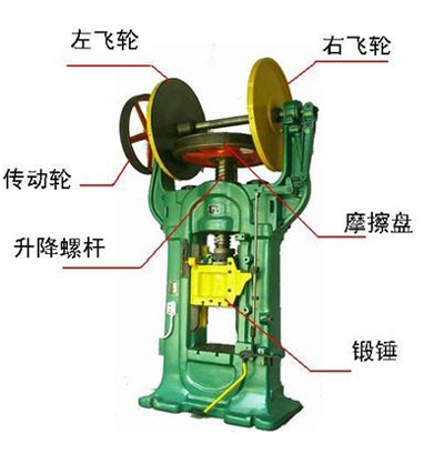 原系統中,傳動輪在異步電機的牽引下單向旋轉。當左飛輪接觸摩擦盤時,鍛錘通過升降螺桿被舉起。當右飛輪接觸摩擦盤時,鍛錘加速下降擊打工件。