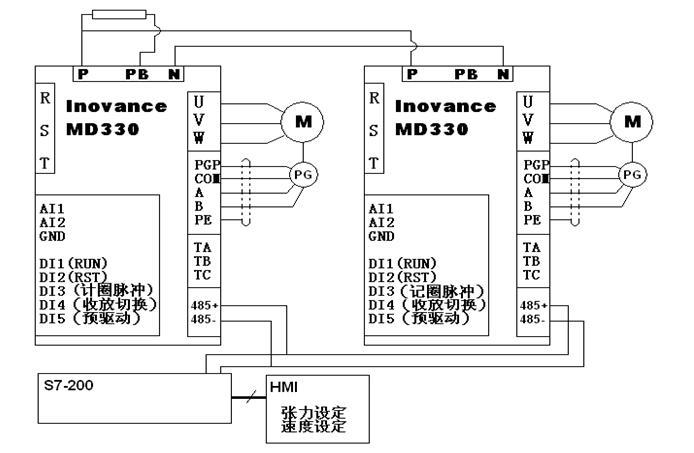 該卷染機的控制系統以西門子作為控制器,采用觸摸屏作為人機界面,它們主要完成的是張力,線速度的設定,布的厚度的測量以及相關邏輯動作的控制。變頻器和PLC之間采用485通訊。采用通訊方式的好處是可以隨時知道變頻器主要變量的信息,減少接線,使得整個系統看起來很精簡。接線示意可見圖五。由圖中可見:兩臺完全一樣的變頻器,它們均工作于閉環矢量控制模式,由于卷染機在接近滿卷時候會較長時間工作在很低的頻率下(1~3Hz),采用較高線數的編碼器有助于提高在低轉速工況下的控制性能,同時考慮散熱,需要采用變頻專用電機。