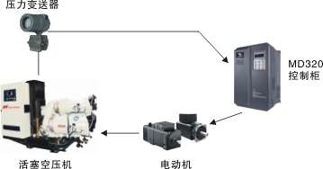 一、工藝要求 空氣壓縮機是用來使氣體增加壓力,以利于輸送并提高氣體的壓力能,從而滿足生產工藝或動力設備需要的一種專用機器,在陶瓷、玻璃、玩具、制衣、機械制造、塑料、拉絲等多個行業中普遍應用。傳統的活塞式壓縮機靠壓力繼電器進行啟停控制,壓縮電機一般采取直接啟動或傳統的降壓啟動方式,啟動存在較大的電氣和機械沖擊,且壓縮機存在供氣壓力波動大、壓縮電機啟停頻繁易損壞、噪音大、機件磨損快、維護量大、維護成本高等實際應用缺陷。 二、改造方案 空壓機變頻控制系統由變頻器、壓力傳感器、控制指示線路組成,簡圖如下: