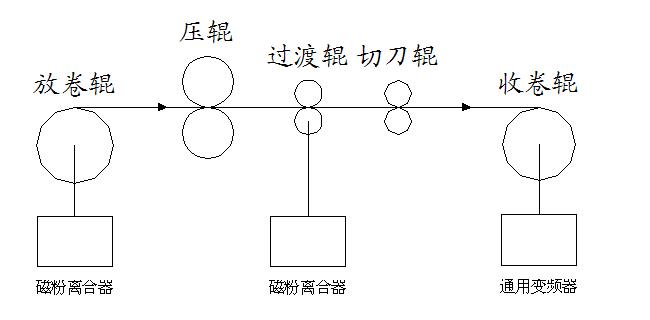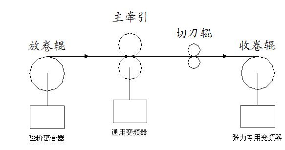 設備在改造前的現(xiàn)狀如下圖所示,鋁板(該公司的分條機主要用于鋁板分條)從放卷輥出來后在經過切刀輥處縱切成若干條鋁條后收卷到收卷輥上。其收放卷分別采用磁粉離合器控制和通用變頻器控制,壓輥起張力隔斷作用,收放卷的張力分別由壓輥前后的磁粉控制。收卷變頻器工作在速度控制模式下,這樣,在不調節(jié)收卷電機速度的情況下,隨著收卷卷徑的逐漸變大,整機的線速度會越來越快,而磁粉離合器在高速場合下張力控制不穩(wěn),分條出來的鋁條幅寬誤差范圍較大(50個絲),端面粗糙不平,甚至出現(xiàn)鋁條跑偏現(xiàn)象,所以在分條過程中需要人為的進行減速。這樣,不僅設備無法實現(xiàn)高速分條,而且對操作工的要求較高,不同的操作工生產出來的產品質量不一樣,生手的操作工做出來的產品合格率較低。這對廠家來說不僅生產效率低,而且還造成了資源浪費。改造前,該設備已經無法正常生產。