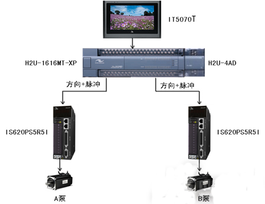 該系統使用IT5070T來設置泵的壓力上限值、吸液速度、排液速度、工作模式選擇,并顯示流量及壓力等參數。采用H2U-1616MT-XP來進行整個系統的控制,恒速模式主要是保證流量恒定即保證伺服轉速恒定,恒壓模式主要是通過PLC的PID控制伺服轉速來保證壓力恒定。4AD主要用來檢測缸內壓力值。