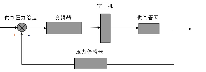 根據用戶需要,先設定“給定壓力值”,系統運行后則壓力變送器檢測管網的“實際壓力值”送往變頻器,變頻器經過PID運算控制變頻器的輸出電壓及頻率,當用氣量增加,輸出頻率升高,電機轉數升高,供氣量增加;當用氣量減少時,電機轉速降低,供氣量減少,從而使管網供氣壓力恒定。控制原理圖如下所示: