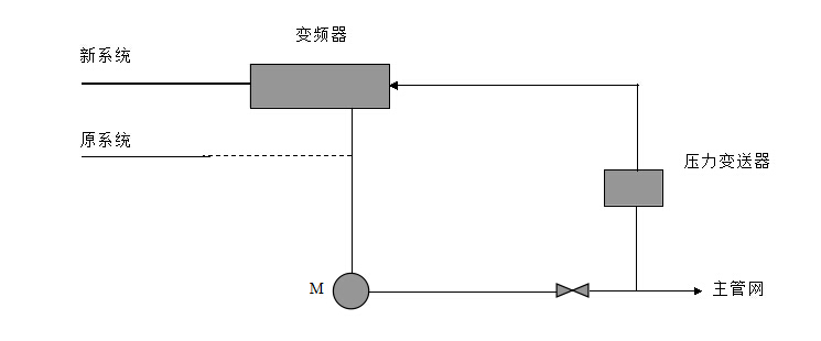 為了滿足生產要求,本著節約及盡量不改動原有設備的目的,以及生產的需要。我們對132KW空壓機進行變頻控制。根據供氣要求,變頻與工頻有電氣聯鎖,為使系統安全可靠,變頻裝置與原系統有聯鎖及切換功能。新系統具有過流、過壓、欠壓、過載等保護功能。下圖為系統構成圖,該系統由一臺空壓機,一臺變頻器,一只壓力變送器。通過變頻電控柜上的面板可顯示運行參數和故障報警等。