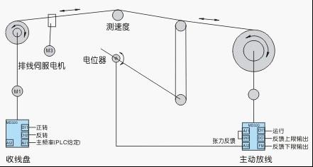 PLC根據(jù)檢測(cè)到的線速度信號(hào)運(yùn)算后模擬輸出調(diào)節(jié)收線變頻器的頻率,頻率隨著卷徑而改變。當(dāng)層繞過(guò)程中亂絲時(shí)還可控制它的反轉(zhuǎn)后重繞,反轉(zhuǎn)時(shí)放線架自動(dòng)將 多余的線收回。電位器的反饋信號(hào)輸入放線變頻器來(lái)控制張力恒定,此時(shí)變頻器頻率源設(shè)為主頻率加輔助頻率,主頻率為0(設(shè)為AI1,并將AI1與GND斷 接)輔助頻率設(shè)為PID,PID目標(biāo)值用面板給定(50%)。