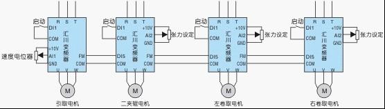 吹膜機摩擦收卷系統控制方案說明: ■ 采用速度差方式進行張力控制; ■ 利用高速脈沖口保證引取、二夾輥、收卷輥之間的基本同步比例關系,隨后用張力電位器給定一個疊加速度,使其與系統速度產生速度差形成張力;