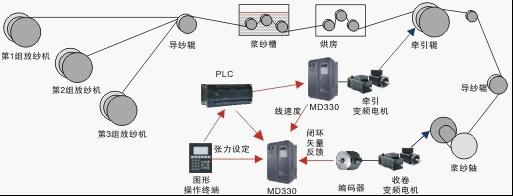 牽引電機功率15KW,考慮到會長期低速運行,選用獨立冷卻風扇的變頻電機+旋轉編碼器PG,和MD320T15G矢量變頻器一起構成閉環(huán)矢量控制拖動。牽引機的功能主要有兩個,第一是拖動烘缸,烘干上過漿的紗線;第二是牽引兩層紗線進行有序排列。