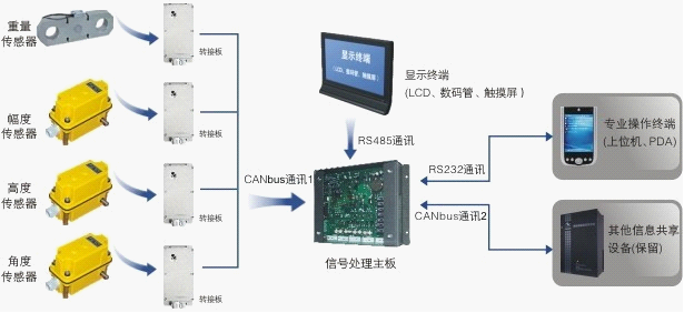 該產品以通訊總線為信息連接交換平臺,具有可靠性高、模塊化、記錄信息多等特點。 ■ 以CANbus總線為物理層,采用全數字化的數據采集系統; ■ 擁有海量存儲器,實時記錄各項數據(拉力、風速、力矩限制、幅度限制等),對整個系統進行安全控制,故障報警和故障記錄; ■ 開放式網絡,便于擴展無線監控、PDA終端等監控設備,便于和人機界面、顯示屏、數碼管、液晶等顯示終端連接; ■ 轉接板與傳感器就近安裝,通過CANbus總線傳輸數據,提高數據精度,增強抗干擾能力; ■ 采用防水設計,適應野外惡劣環境