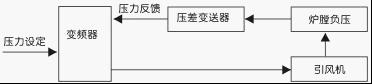 鍋爐引風機閉環控制原理框圖如圖所示,采用微差變送器、變頻器、引風機組成的壓力閉環回路自動控制引風機的轉速,使爐膛保持穩定的微負壓。
